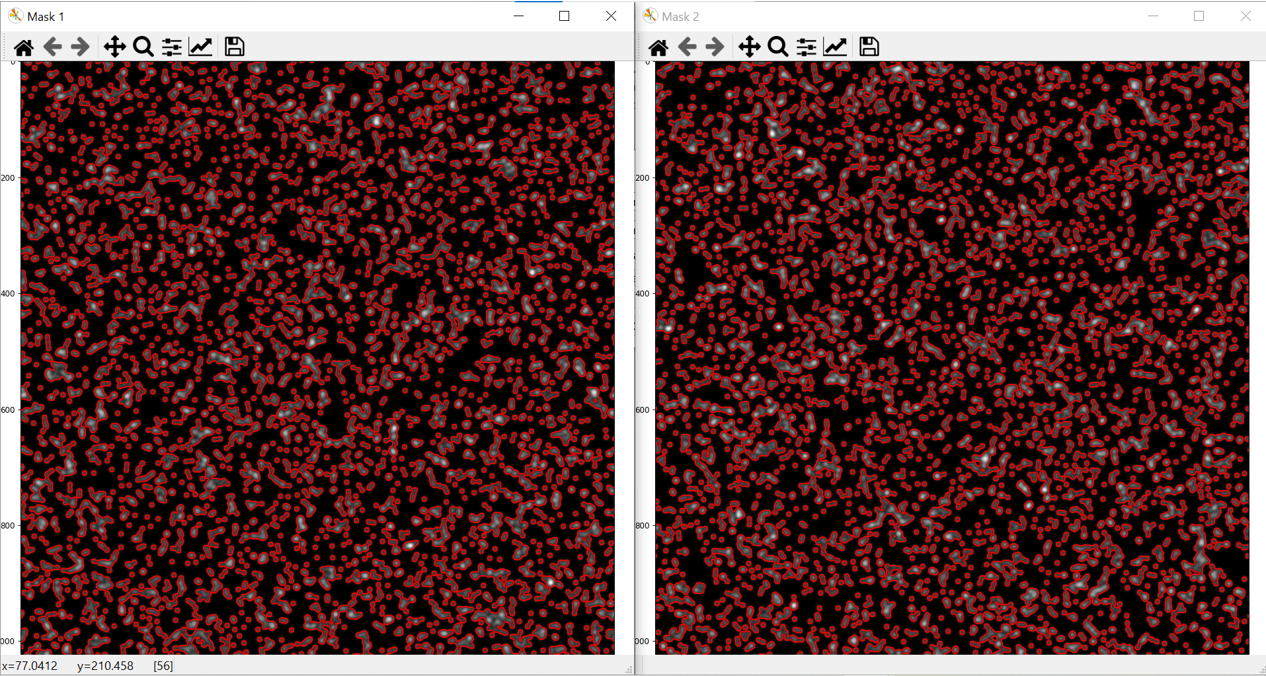 - PyBioProx will create two .png image files (for mask 1 and 2) showing object detection (middle slice if analysing a Z-stack image) .png files will be saved to the input folder.