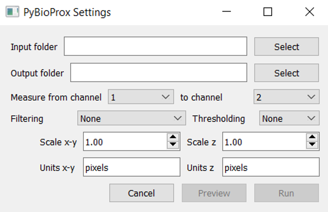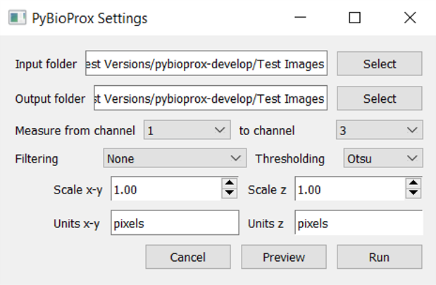 5: PyBioProx currently only provides a limited number of preprocessing operations. A gaussian filter (sigma 3) can be performed on images if required by selecting from the ‘Filtering’ dropdown menu. If any other preprocessing is required, this should be performed (e.g. in Python or ImageJ) before loading the images into the PyBioProx GUI. The CBS test images do not require preprocessing, so leave the ‘Filtering’ parameter blank.